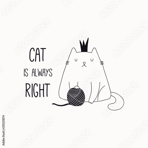 Hand Drawn Black And White Vector Illustration Of A Cute Funny Cat In A Crown With