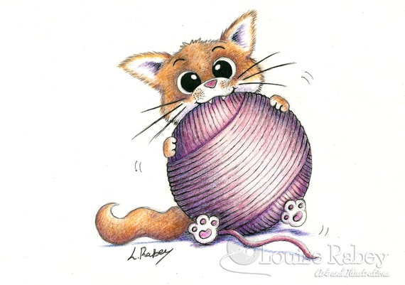 Print Of Original Drawing Kitten Playing With A Ball Of Yarn Etsy